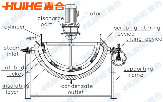Tilting Jacketed Kettle is mainly composed of pot and tilting frame; and the pot is the double layer structure formed by inside and outside spherical pot; middle layer can add steam to heat.