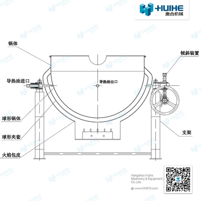 可傾式電加熱夾層鍋主要是由半球形罐、支架、翻轉(zhuǎn)裝置、攪拌裝置等部分組成