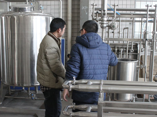 2015年3月2日,河南客戶自主創(chuàng)業(yè)需要采購(gòu)一套豆?jié){生產(chǎn)線設(shè)備,來(lái)我公司考察并與業(yè)務(wù)員進(jìn)行具體需求的洽談。下圖為業(yè)務(wù)員向客戶講解工廠設(shè)備: