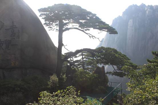 黃山迎客松,800多年的樹齡,樹干中部伸出長(zhǎng)達(dá)7.6米的兩大側(cè)枝展向前方,恰似一位好客的主人,揮展雙臂,熱情地歡迎五湖四海的賓客到黃山游覽。